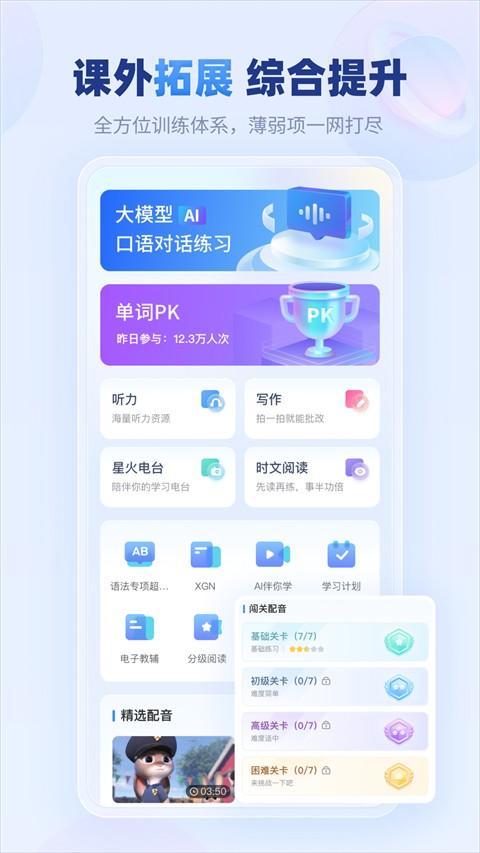 E听说中学学生端app是专为初高中学生设计的英语学习辅助软件,该软件严格依据初高中教学大纲和教材内容定制学习资源,并采用科大讯飞先进的语音测评技术与手写作文批改系统,按照考试标准对口语、听力及写作能力进行专业评估,有效帮助学生提升英语成绩,从容应对升学考试。学生可通过该应用针对个人薄弱环节进行强化训练,涵盖口语表达、听力理解、写作能力及阅读理解等多个维度。软件搭载的权威测评技术能够实时进行语音评测和作文批改,让学生直观了解自身英语水平及不足之处,从而进行针对性学习。此外软件还提供专业编制的模拟试题,学生可随时进行实战演练,准确评估学习成效。