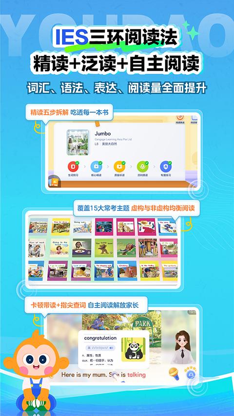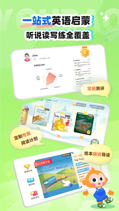 2、基于庞大的PM分级绘本库,采用IES三环阅读法为用户定制精读计划。内容体系分为9个级别30个进阶,确保用户找到适合的阅读材料