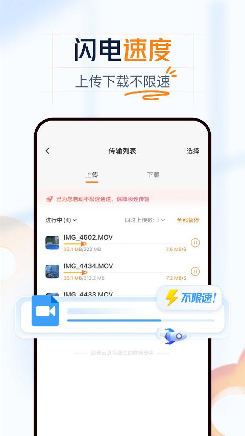依托联通高速网络优势,实现上传下载全速传输,保障云端操作流畅性
