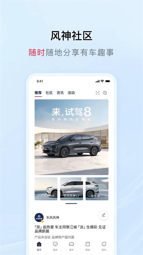 提供经销商信息查询、试驾预约及活动参与等功能,优化购车流程。同时支持社区发帖互动与积分获取等特色服务。